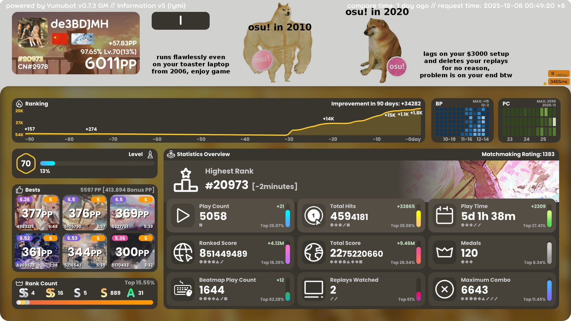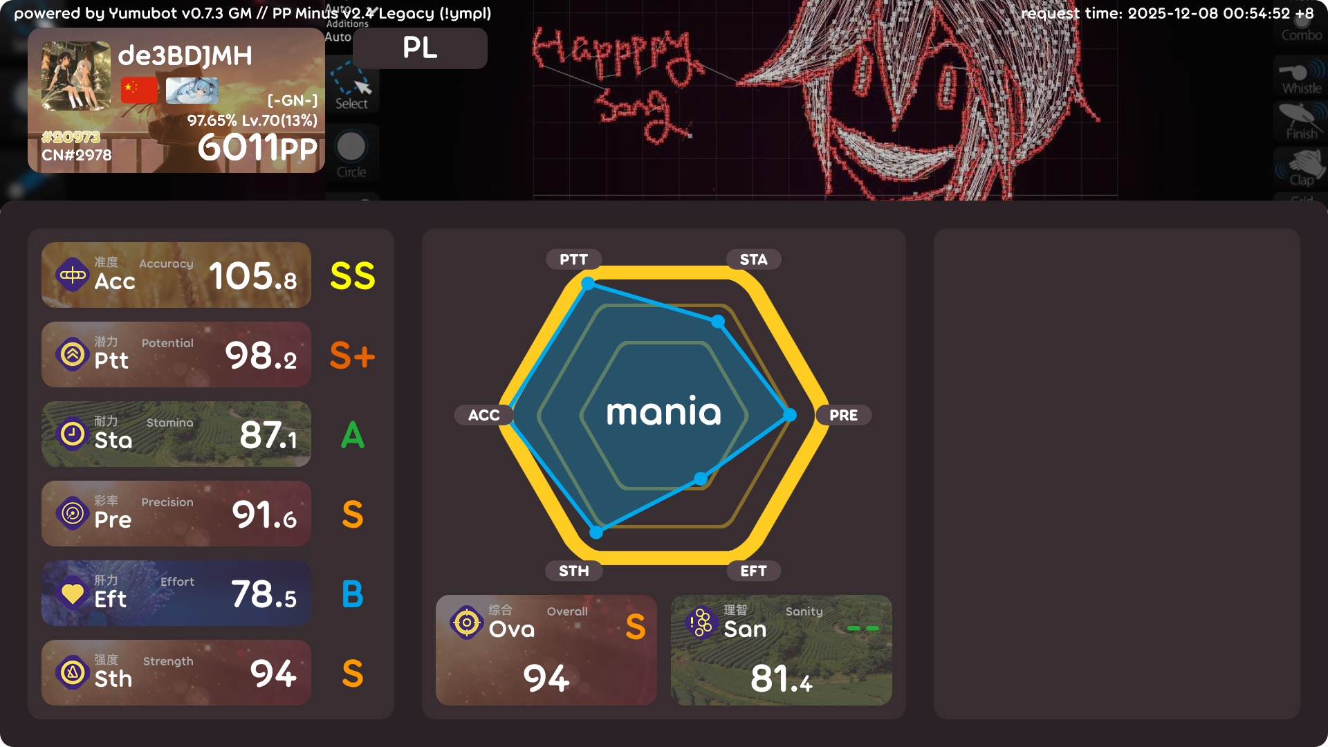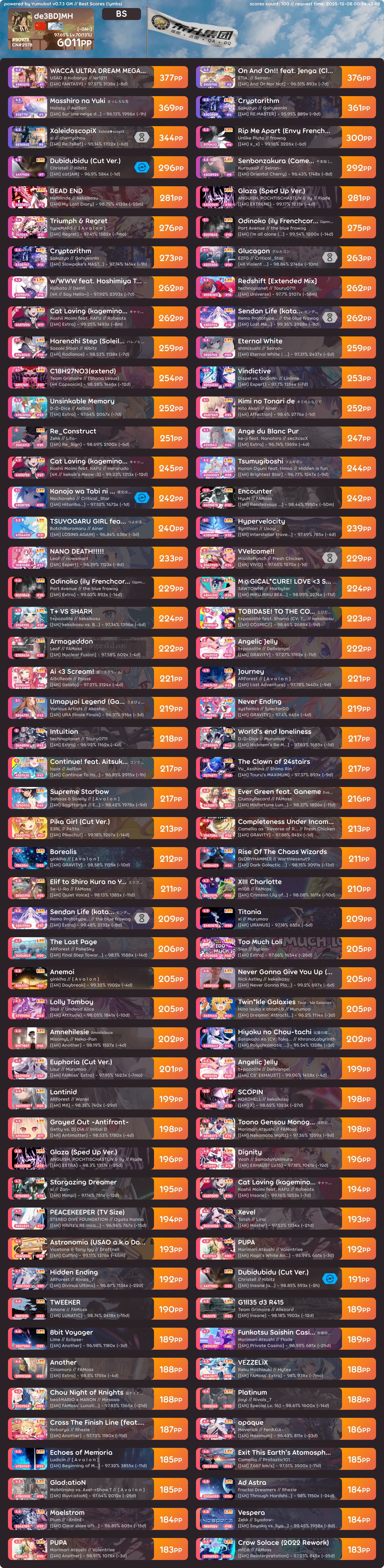 4k 6000pp 达成! 2025年12月08日 67 字 大概 1 分钟 开始感觉有点卡顿了…感觉很快就要提升不动了 能打一些叠了之后吃了很多pp,acc也高很多 !bs200个的图片过期了,只有这个100个的了,不过应该也很够了 !ba !i !k !pl !pm