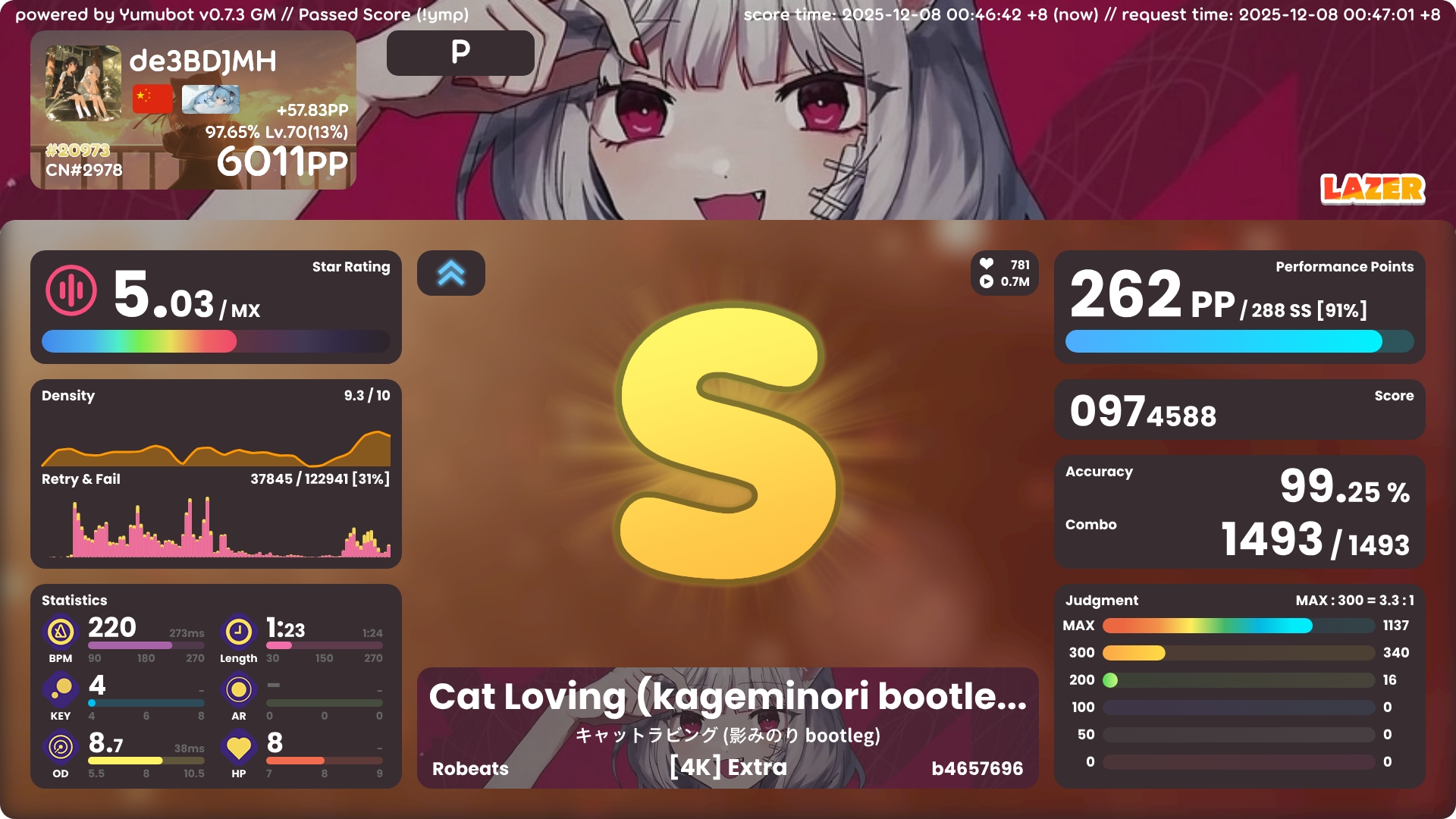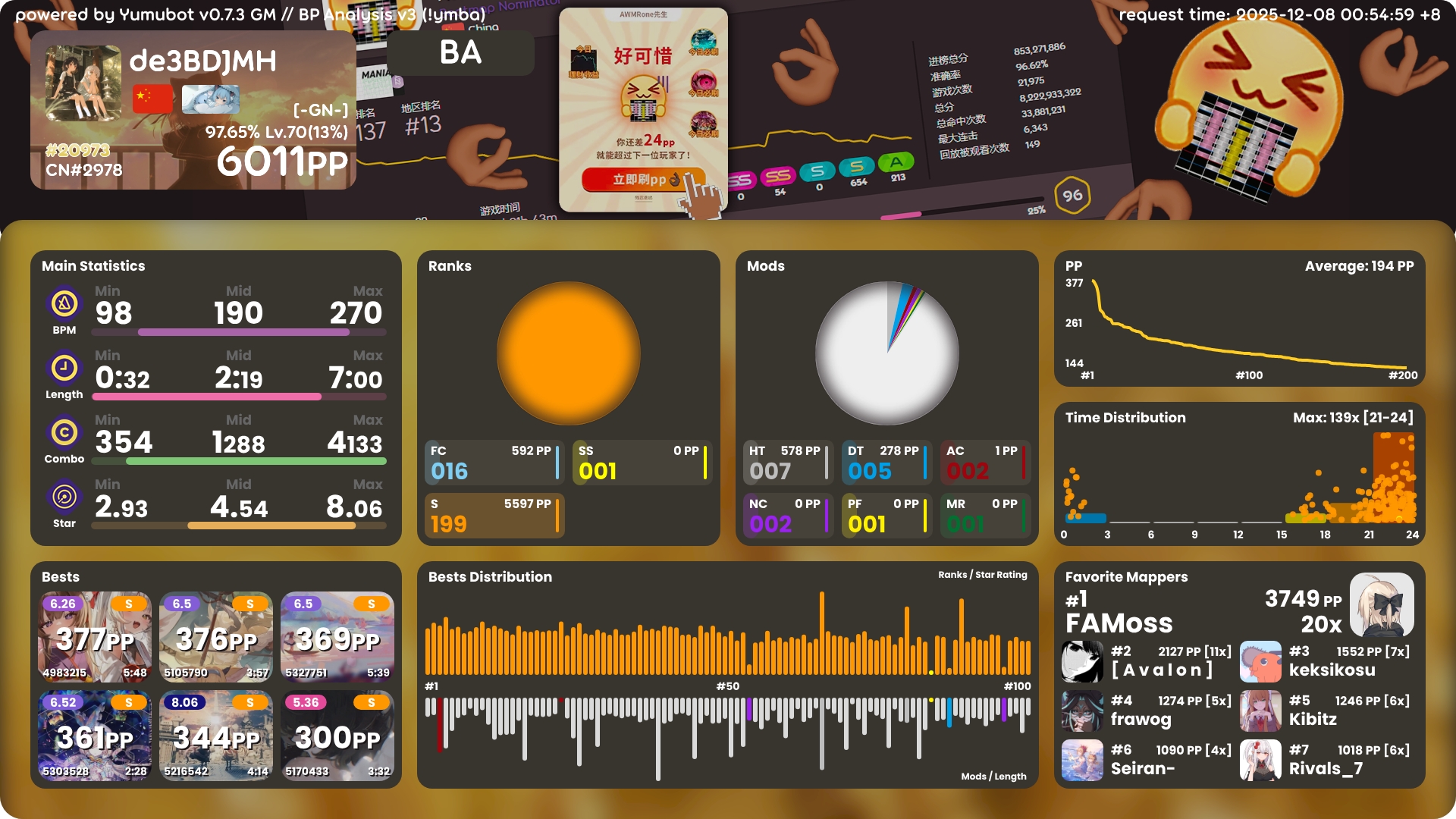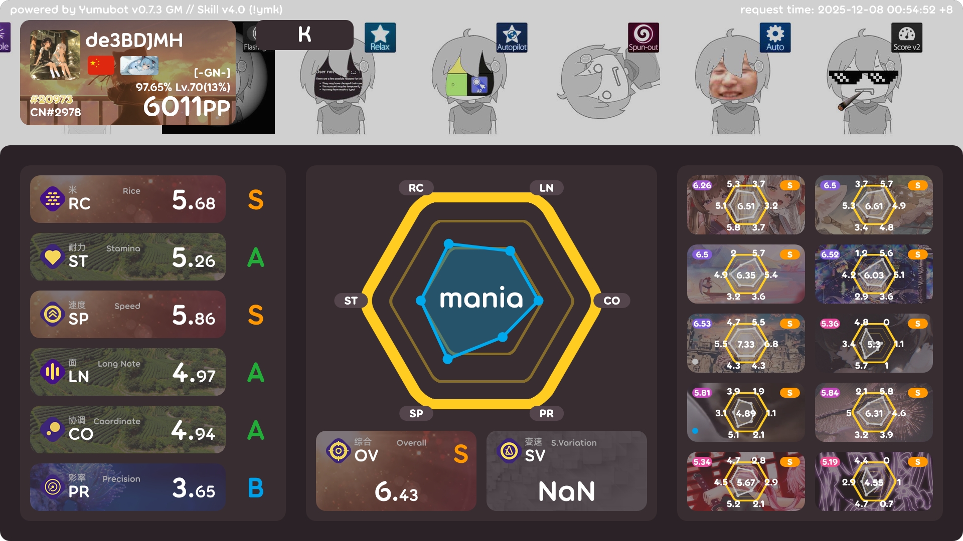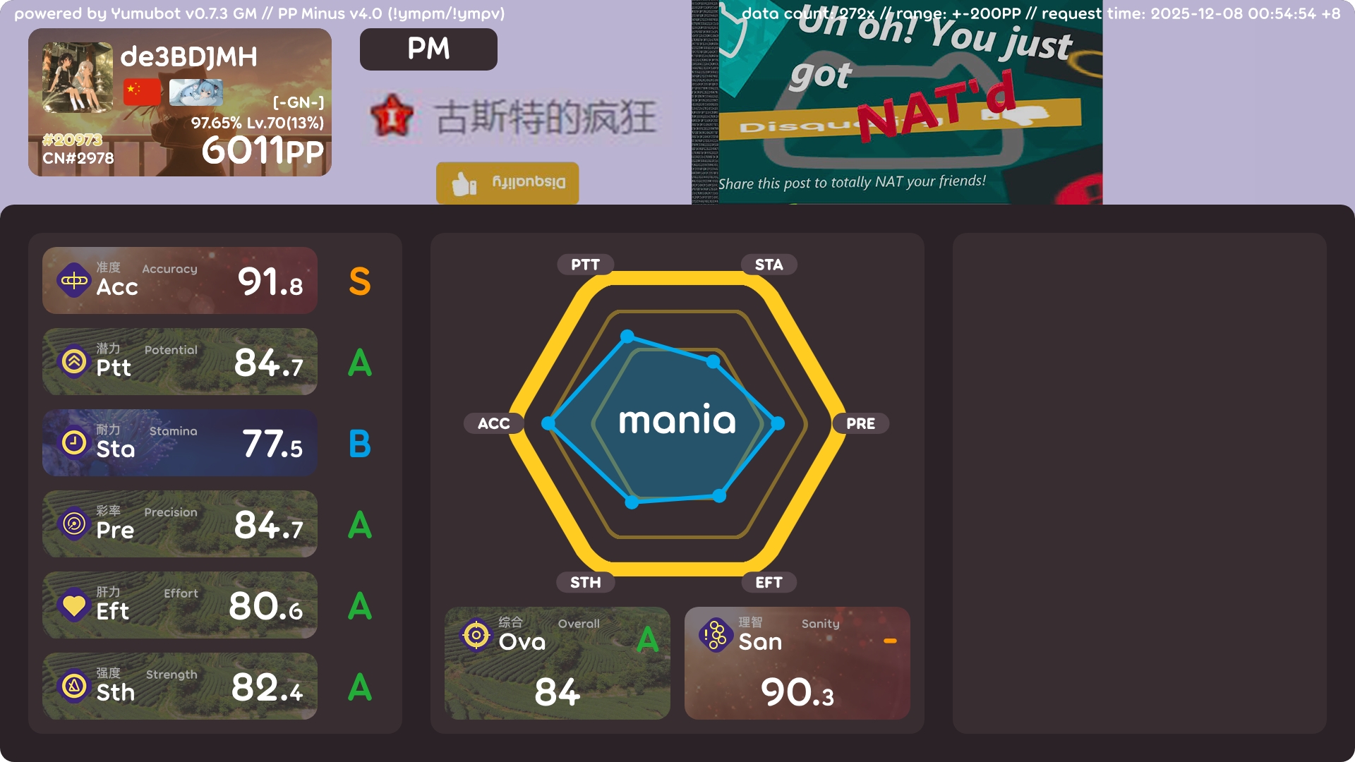 4k 6000pp 达成! 2025年12月08日 67 字 大概 1 分钟 开始感觉有点卡顿了…感觉很快就要提升不动了 能打一些叠了之后吃了很多pp,acc也高很多 !bs200个的图片过期了,只有这个100个的了,不过应该也很够了 !ba !i !k !pl !pm